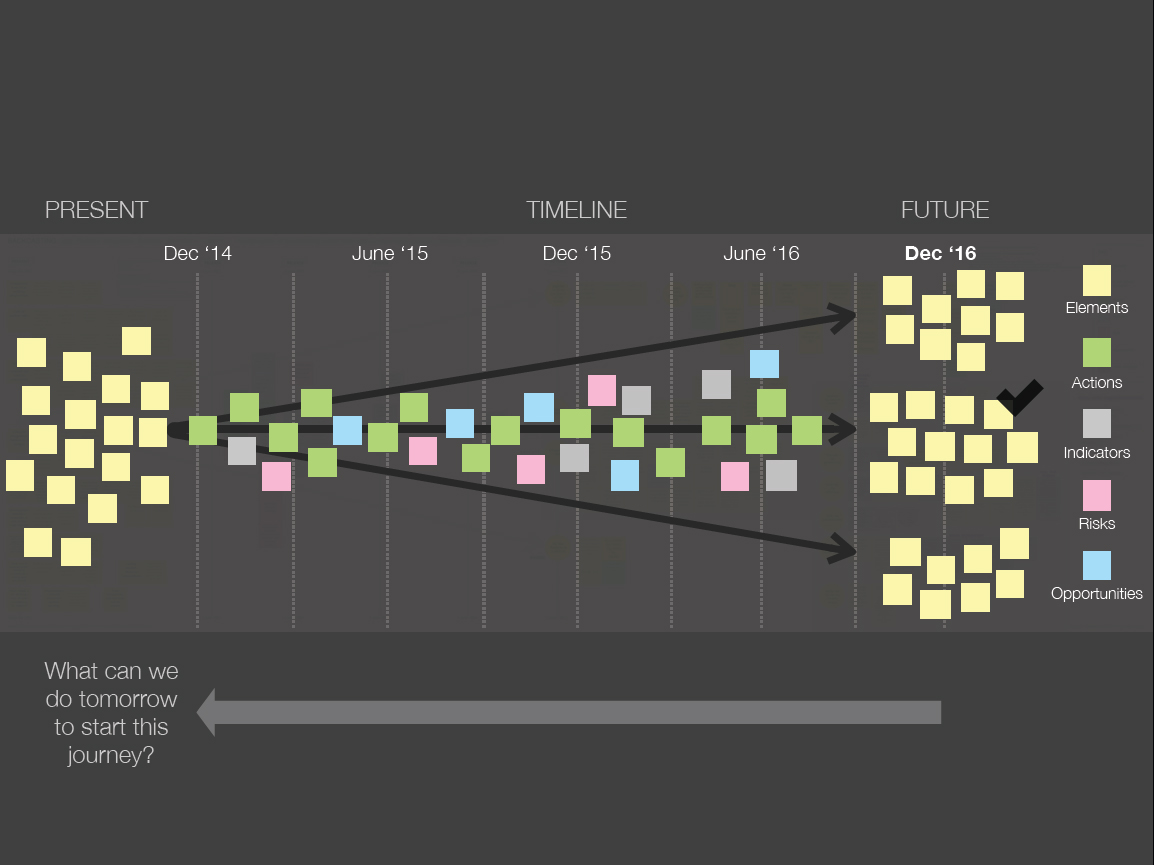 - Reverse engineer how to get there by defining: Actions, Indicators, Risks and Opportunities